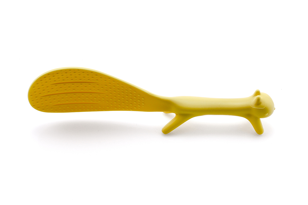 Ложка-лопатка желтого цвета удобной конструкции и интересным дизайном. Для данной ложки не нужна специальная подставка, ведь у нее есть свои ножки. Благодаря чему поверхность, соприкасающаяся с пищей не будет собирать микробов со стола. |
