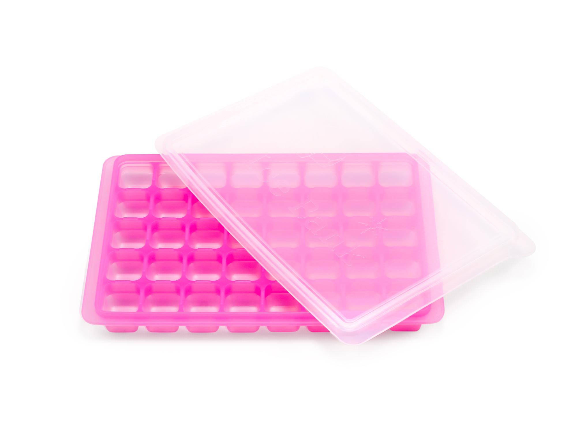 Удобные кубики получаются одинакового размера. Крышка предотвращает впитывание запахов. Форма легко выворачивается - лед выпадает сам.