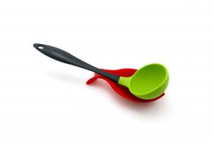 Силиконовый половник можно повесить на любой крючок в вашей кухне. А яркая расцветка кухонного прибора украсит ее дизайн.