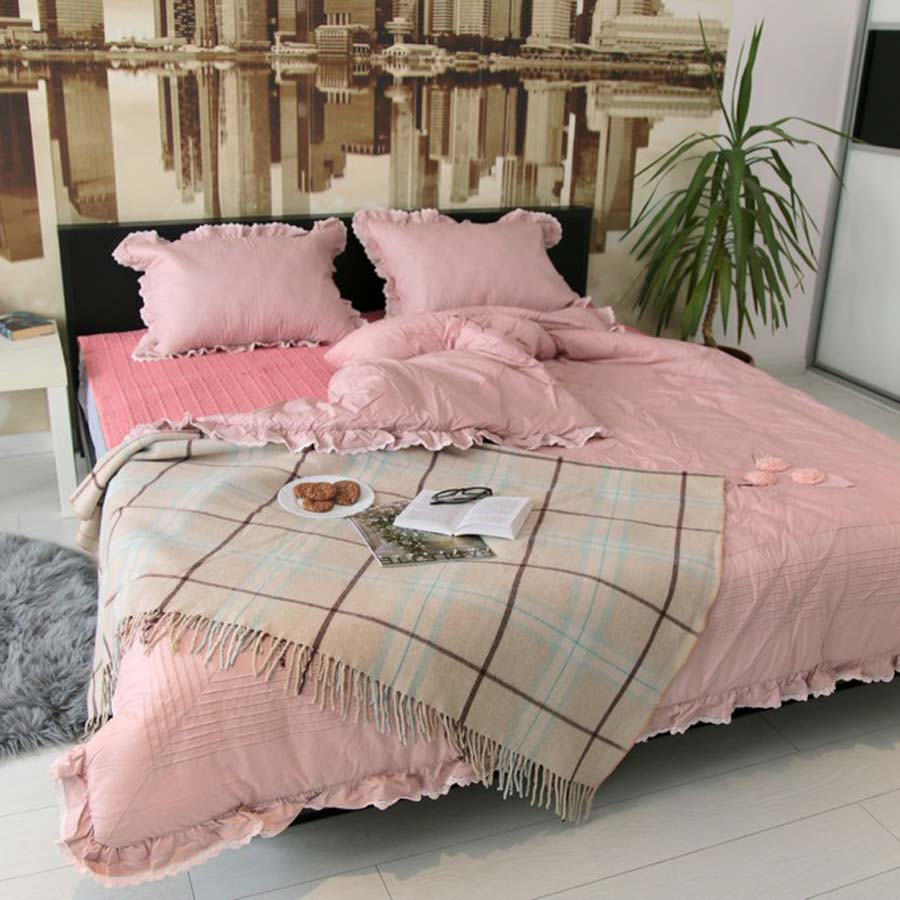 По краю наволочек и одеяла выполнены изящные воланы, которые скрадывают некоторую строгость линий изделий и оживляют их. Изысканное кружево обрамляет оборки, делая комплект по-настоящему прелестным.