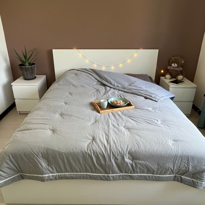 Размер идеальный для моей двуспальной кровати, укрываюсь с головой и ещё место остаётся. Серый цвет вписывается в любой интерьер. Материал качественный, не скатывается. Теплоизоляция отличная. Стирала уже пару раз форму держит прекрасно, не теряет своих свойств. В общем, покупкой более чем довольна, теперь это моё любимое одеяло!