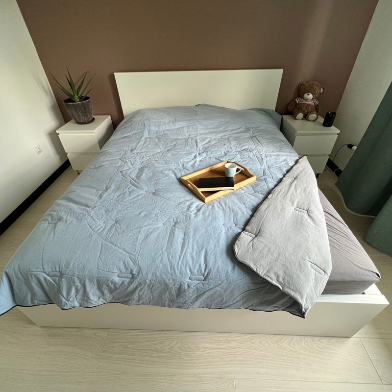 Очень довольна одеялом, нежный голубой цвет создаёт уютную атмосферу в спальне. Лёгкое, но тёплое. Материал приятный на ощупь, не вызывает раздражения.
