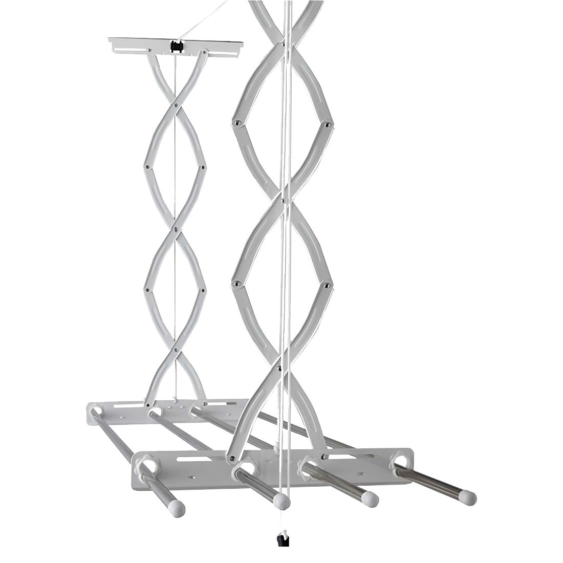 Для подъема или опускания сначала потяните ручку вниз и потом на необходимой высоте отведите ручку в сторону (от сушки вдоль перекладин) и резко отпустите. Фиксация происходит по типу механизма жалюзей. Фиксировать сушилку можно не только в крайнем верхнем и нижнем положении, но и на любом другом удобном Вам промежутке до крайнего нижнего положения.